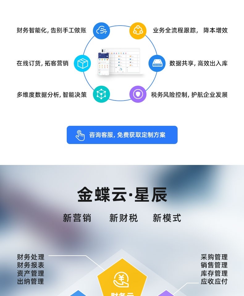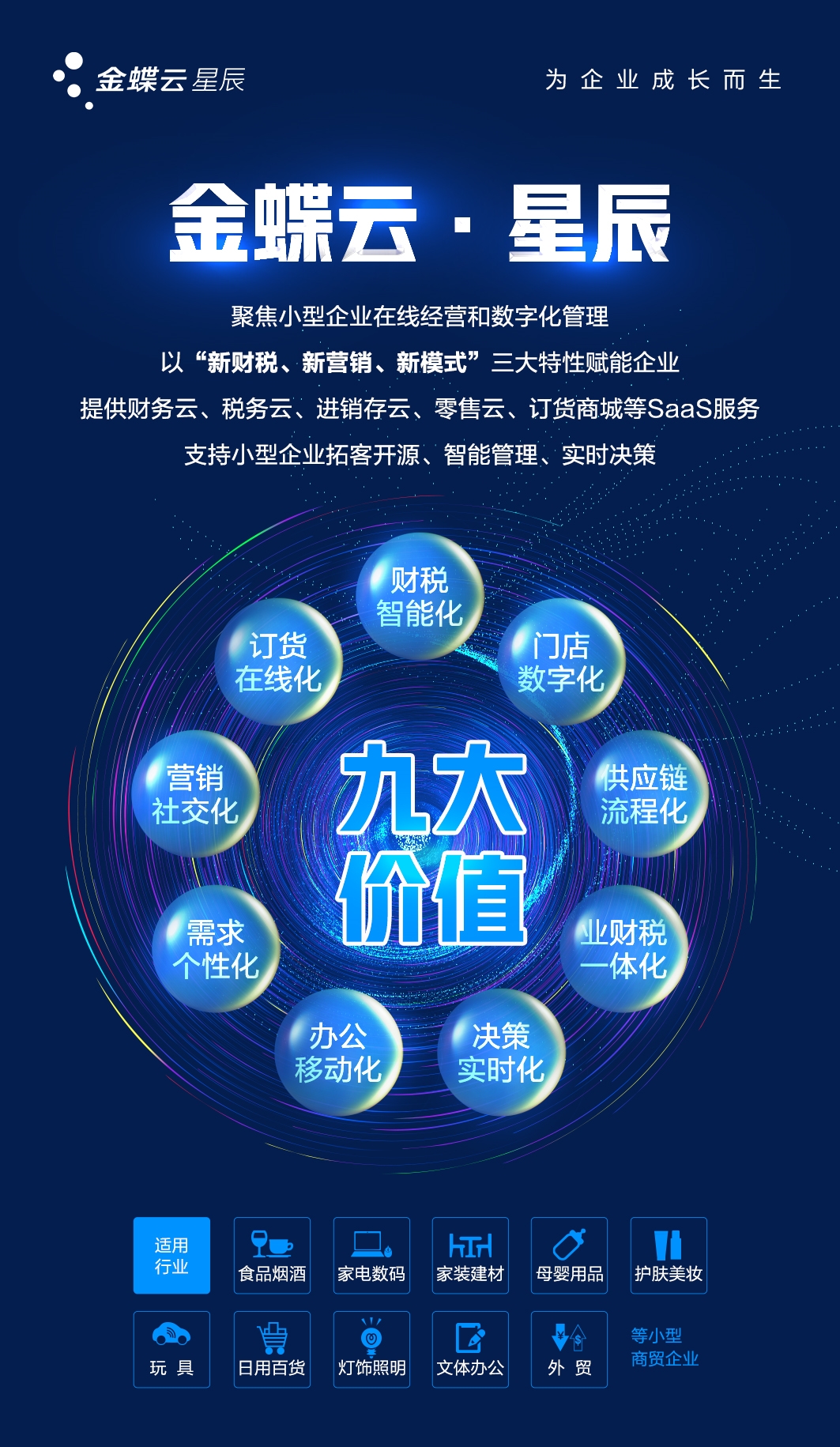 金蝶云?星辰,是基于金蝶云·蒼穹PaaS平臺而生,構(gòu)建小微企業(yè)智慧成長的一站式服務(wù)平臺。其聚焦小微企業(yè)在線經(jīng)營和數(shù)字化管理,以“新財(cái)稅、新營銷、新平臺”三大特性賦能企業(yè),提供財(cái)務(wù)云、稅務(wù)云、進(jìn)銷存云、訂貨商城等SaaS服務(wù),九大價(jià)值賦能企業(yè),支持企業(yè)拓客開源、智能管理和實(shí)時(shí)決策。