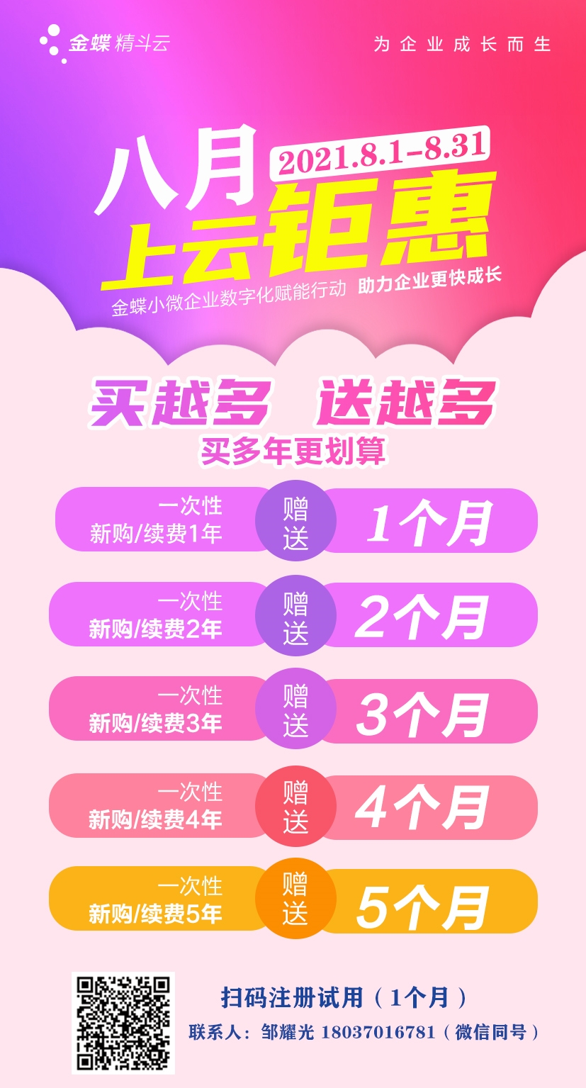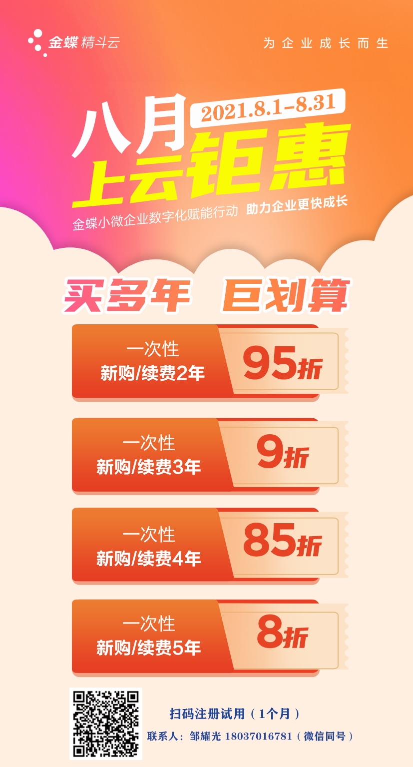 洛陽金蝶軟件,洛陽財務軟件,2021.8月金蝶精斗云促銷活動介紹: