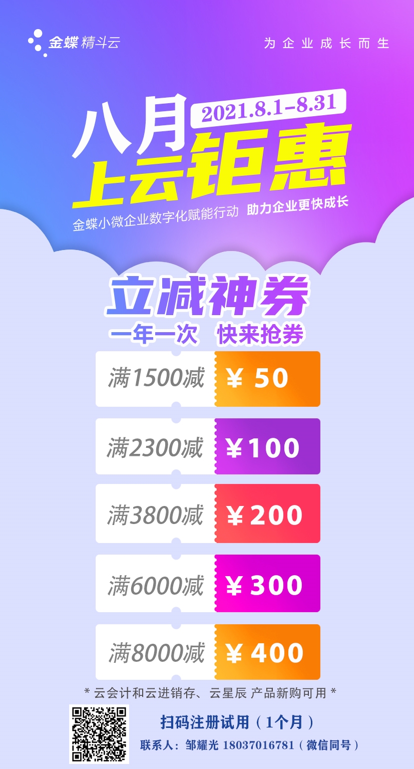 金蝶精斗云系列:金蝶云會計,金蝶云進銷存,金蝶云財貿,云會計個人版 8月活動。