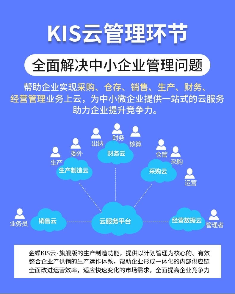 金蝶KIS云是金蝶集團面向小型企業的管理軟件品牌,為小型企業提供財務、生產、銷售、采購、倉存、零售、電商等云服務。金蝶KIS云秉承“讓生意更成功”的理念,助力企業一鍵上云用云,讓企業管理更高效,并通過創新的技術,帶給企業上云全新體驗。金蝶KIS云包含金蝶KIS云·旗艦版,金蝶KIS云·專業版,金蝶KIS云·商貿版等系列產品。