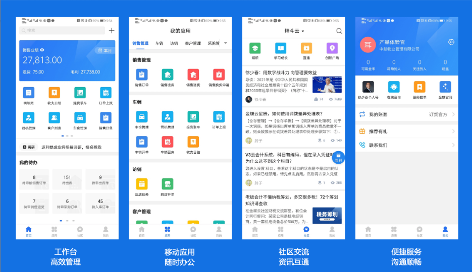 金蝶云APP為客戶提供了產品全旅程體驗。首先,用戶可以通過首頁的產品精選案例,提前了解產品詳細信息。購買后,用戶可登錄進入自有產品的工作臺,實現便捷移動辦公。同時,金蝶App為用戶搭建了互動交流與答疑解惑的暢聊社區。最后,可通過售后咨詢/在線客服/服務提單等方式快速、便捷地獲取服務幫助。