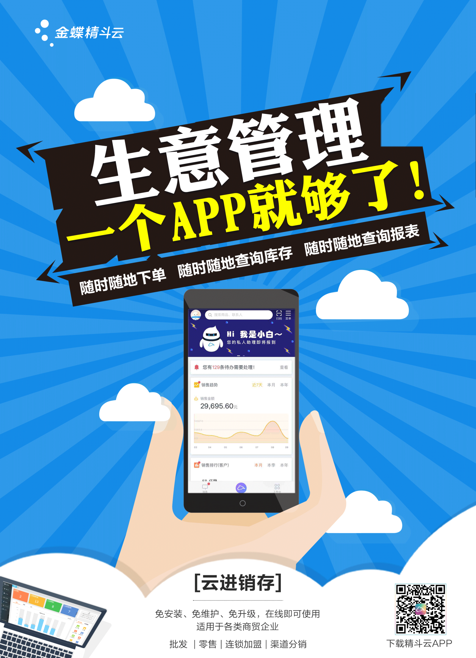 金蝶精斗云 云進銷存免費試用版軟件是金蝶針對小型企業,小微商貿專門定制研發打磨的一款云在線進銷存系統,它不需要再購買任何的軟件、產品、服務器等,只要有電腦 有網絡的地方,登錄金蝶精斗云系統,輸入手機號 密碼 就可以登錄訪問。