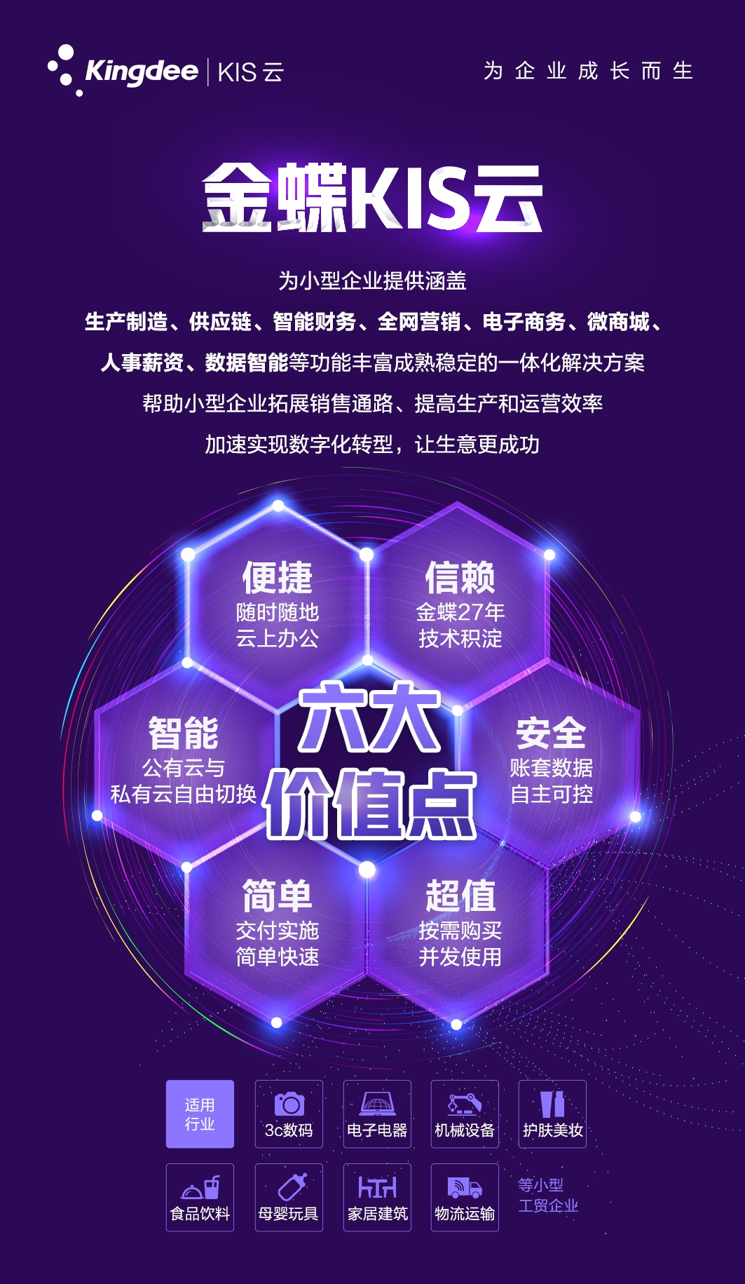 金蝶KIS云是金蝶集團面向小型企業的管理軟件品牌,為小型企業提供財務、生產、銷售、采購、倉存、零售、電商等云服務。金蝶KIS云秉承“讓生意更成功”的理念,助力企業一鍵上云用云,讓企業管理更高效,并通過創新的技術,帶給企業上云全新體驗。金蝶KIS云包含金蝶KIS云·旗艦版,金蝶KIS云·專業版,金蝶KIS云·商貿版等系列產品。