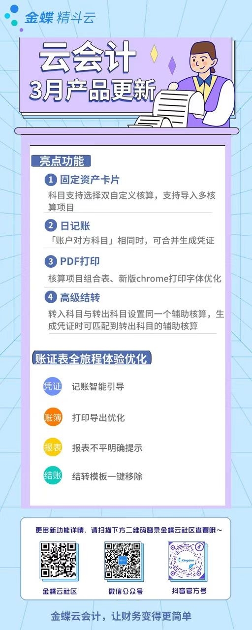 金蝶精斗云·云會計3月產品新特性快來看看您的需求更新了嗎?具體更新功能如下圖 海報: