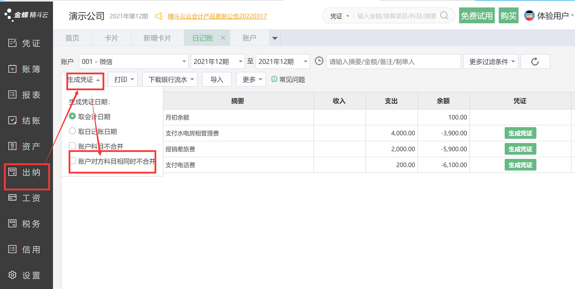 2、日記賬會計科目相同時,系統可以合并生成憑證;