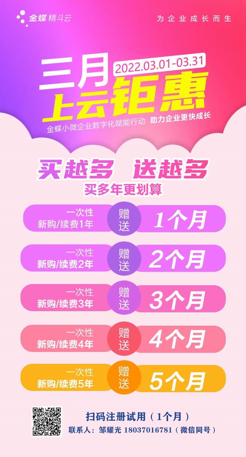 金蝶-云會計2022.3月開通購買 優惠政策如下: