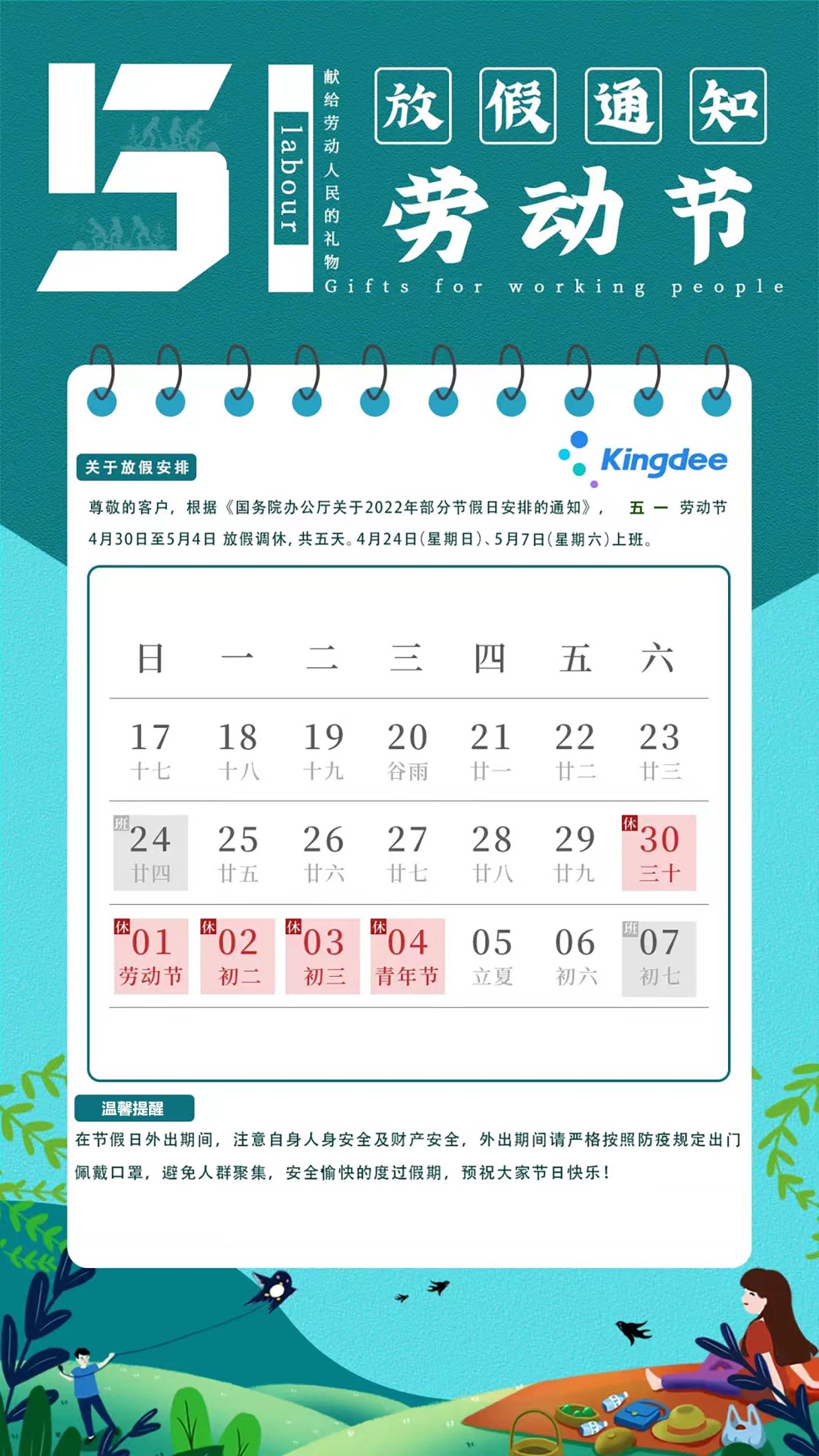 應(yīng)國(guó)務(wù)院要求并結(jié)合本公司情況,洛陽(yáng)金蝶軟件,驍智軟件科技有限公司2022年五一假期放假時(shí)間安排如下: