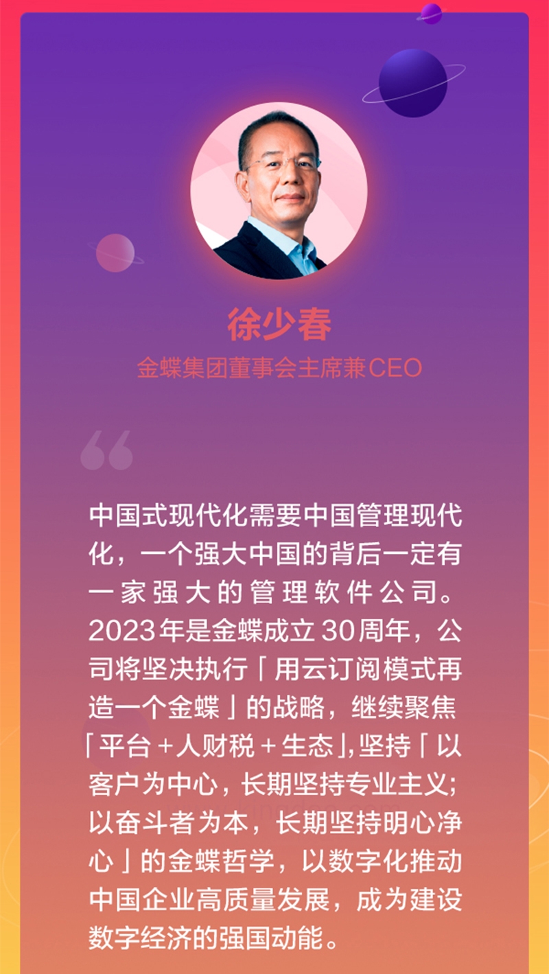 【2023年03月15日,香港】金蝶國際軟件集團有限公司(「金蝶國際」、「金蝶」或「公司」,連同其附屬公司統(tǒng)稱「集團」;股份編號:0268.HK)今日公布其截至2022年12月31日止十二個月(「報告期」)年度業(yè)績。金蝶持續(xù)深化云訂閱模式轉(zhuǎn)型戰(zhàn)略,打造「一箭多星」產(chǎn)品矩陣,云服務(wù)業(yè)務(wù)保持快速增長。
