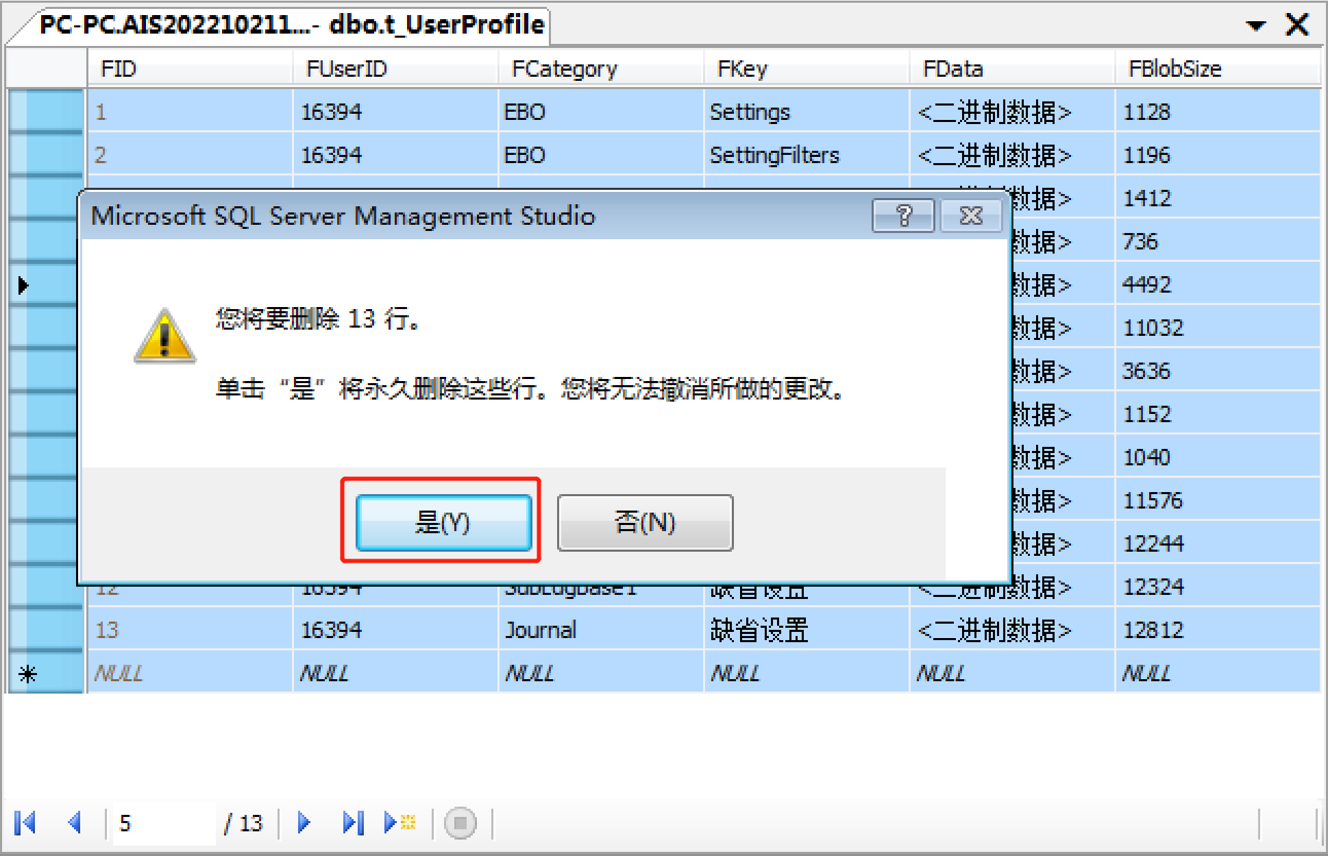 2、userprofile表界面 選中所有行——鼠標“右鍵”——刪除——點 “是”;