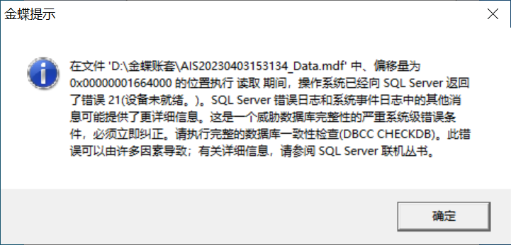 金蝶KIS登錄賬套報錯:偏移量的位置執行讀取期間,操作系統已經向SQL Server返回了錯誤21(設備未就緒。)