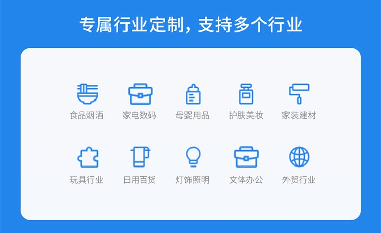 行業覆蓋:服裝鞋帽、數碼電器、母嬰用品、食品飲料、文體辦公、工業材料、家居裝飾、醫藥器械、財稅服務等領域