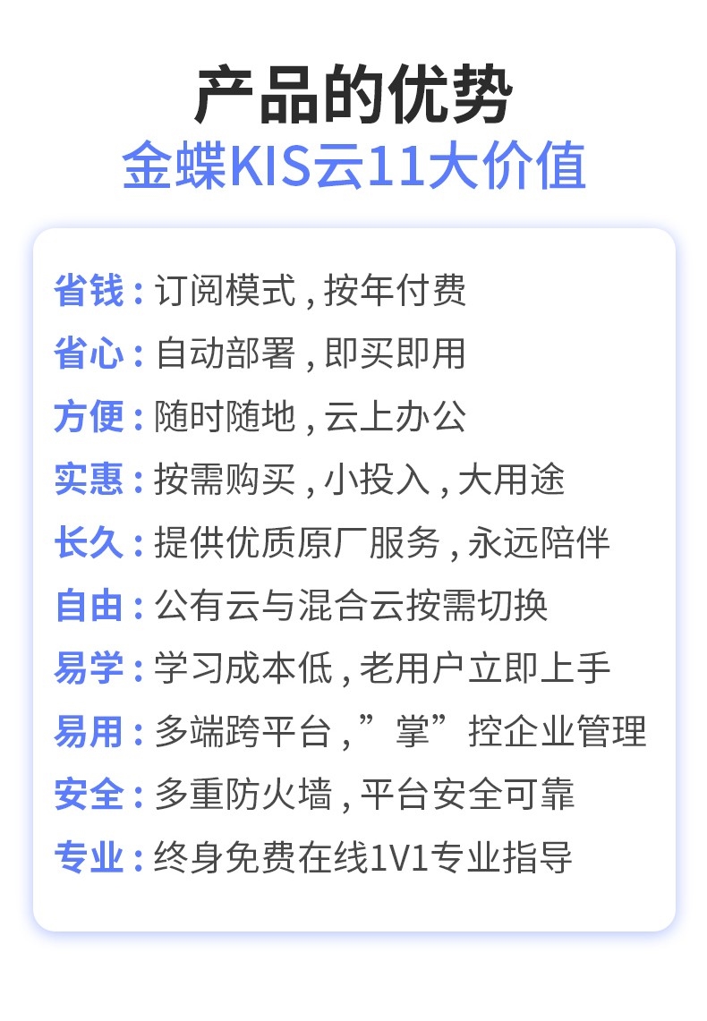 金蝶KIS云是金蝶集團面向小型企業的管理軟件品牌,為小型企業提供財務、生產、銷售、采購、倉存、零售、電商等云服務。金蝶KIS云秉承“讓生意更成功”的理念,助力企業一鍵上云用云,讓企業管理更高效,并通過創新的技術,帶給企業上云全新體驗。金蝶KIS云包含金蝶KIS云·旗艦版,金蝶KIS云·專業版,金蝶KIS云·商貿版等系列產品。
