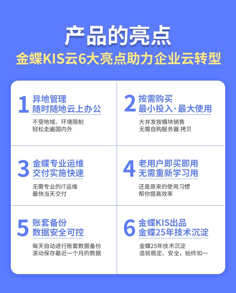 公司近年來積極跟隨金蝶集團發展布局,積極進行云轉型,以致良知、走正道、行王道為企業核心價值觀,讓中國管理模式在全球崛起。憑借金蝶28年對中國企業管理模式的深刻洞察和實踐,基于云計算、大數據、社交、人工智能、物聯網等前沿技術研發的新一代戰略性企業管理軟件平臺,全面支持多組織業務協同、精細管控。我們堅持“以客戶為中心”的宗旨,“為客戶創造價值”的目標,互相尊重,真誠合作,開創共贏,竭力為客戶提供信息化解決方案和良好的服務體驗。